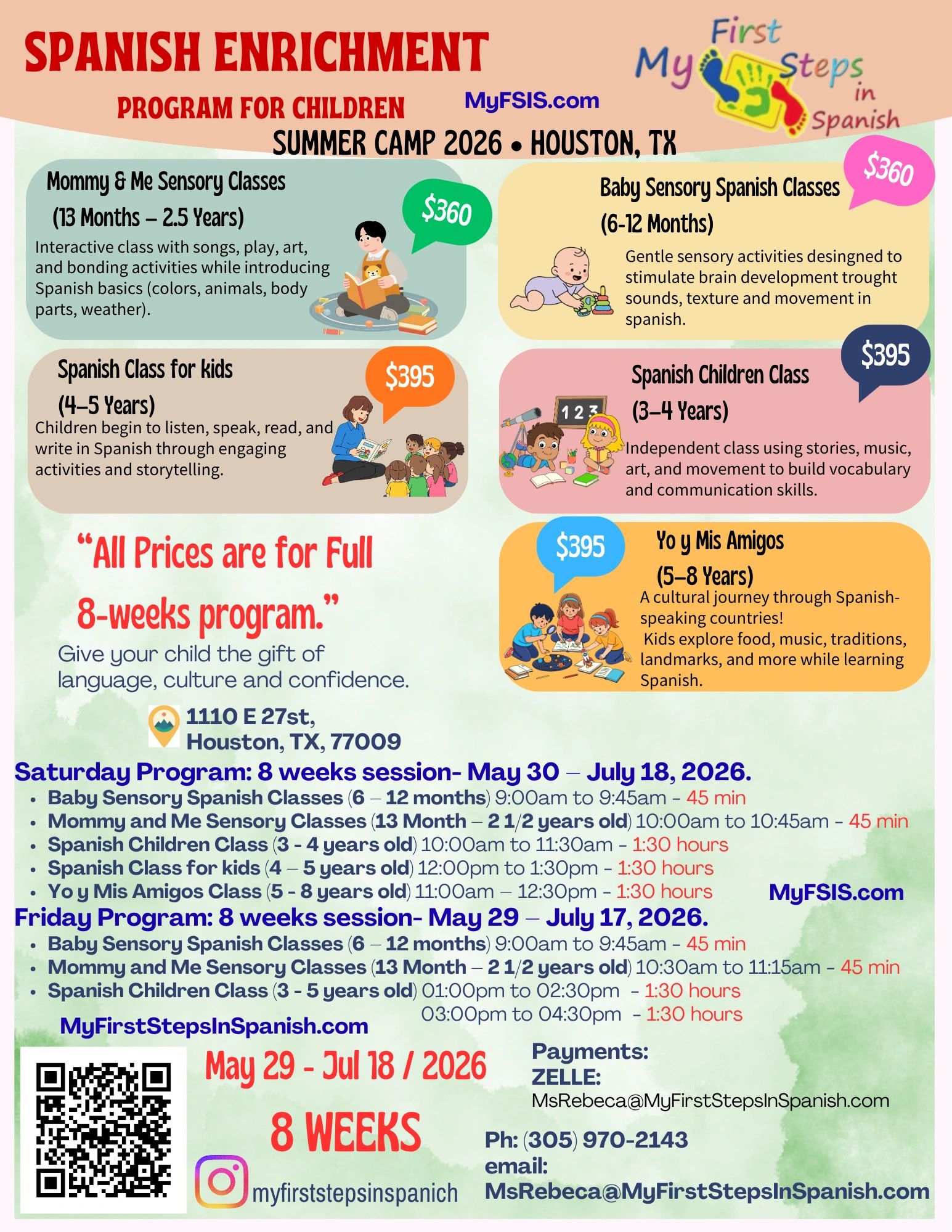 From May 30th through July 18th, join us at 1110E 27th St., HOUSTON, TX, 77009 for engaging Spanish classes for children. These classes are designed to enhance early language learning through a focus on bilingual education. For more details, please contact Ms. Rebecca at (305) 970-2143 or MsRebeca@myfirststepsinspanish.com.